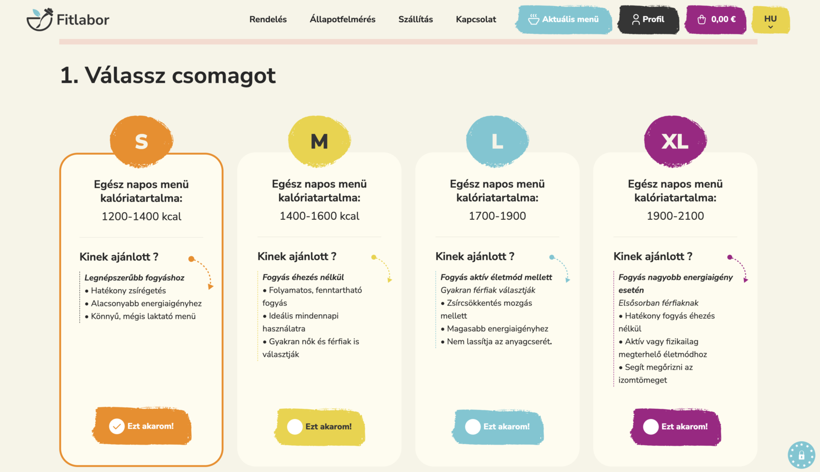 - Interaktív csomagválasztás: a felhasználó cél és napi kalóriabevitel alapján választhat programot.